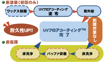 UVフロアコーティングは水性の紫外線硬化樹脂塗料を用いた画期的な新しいフロアコーティングです。